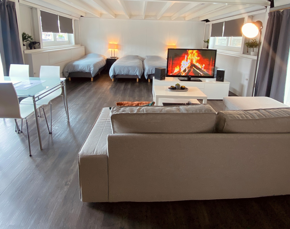 The accommodation is a spacious private room of 48m2 on a houseboat of 200m2 meters. From the room you have a great view of the water with the passing boats and nature. The room has 4 single beds. This modern houseboat has its own toilet, shower and kitchenette. There is also a dining table where 4 people can sit on. A big seating area, flatscreen with chromecast and computer is also available. It is possible to have a open fire in the garden[campfire]