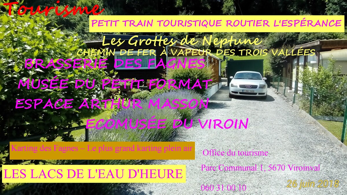 Ibekwe kakuhle phakathi kwamadama e-Eau d 'Heure, eVirelles naseChimay, ikharaveni engayonakalisiyo indalo kule fama. Ukuhonjiswa okulula nokwenene kweholide okunencasa yokuzonwabisa. Ifakwe umbane (ukufudumeza), ithobhi eyomileyo nesinki eneketile yamanzi ashushu. Ioveni ye-microwave. Ishawa yokukhempisha yangaphandle (yaseJerican) (ehlotyeni). Inokuhlala abantu abadala abayi-2 nomntwana omncinci (i-mezzanine) kungekhona usana. Ibhasikithi yesidlo sakusasa eyi- € 8.50 pp, ibhasikithi yokutyela eyi-22.50 pp.