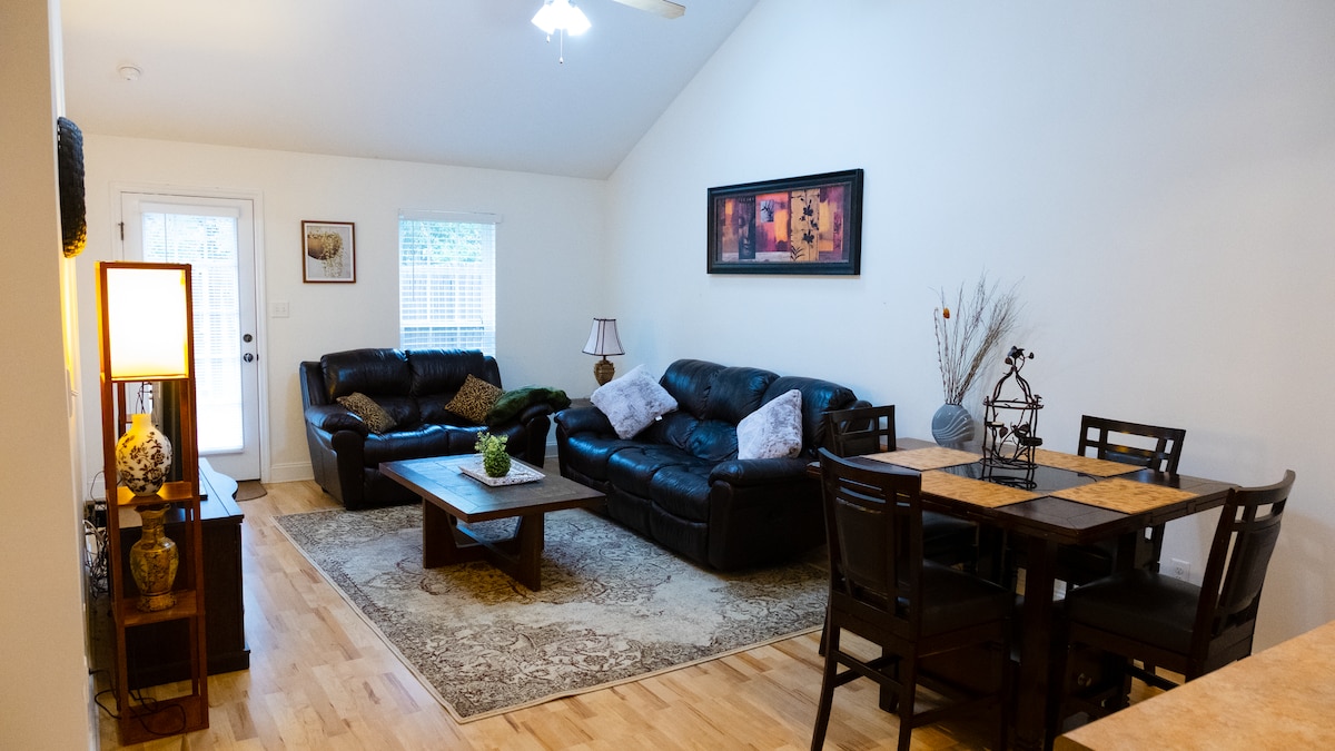 Ngena uthe zava kule ndawo inamagumbi aliqela eyi-3BR 2Bath enezinto ezibalaseleyo kwingingqi ethe cwaka. Ikwindawo elungele intsapho, ithembisa ukuphumla kwindawo epholileyo kufutshane Nezibhedlele Ezinkulu, iAugusta National neFort eGordon. Ukuhonjiswa kwale mihla kunye noludwe lwezinto ezinokusetyenziswa olucebile luza kukwanelisa zonke izinto ozidingayo. Amagumbi Okulala Atofotofo (Iibhedi Ezinkulu) Vula Ukuyila Ikhitshi Elixhotyiswe ngokupheleleyo Idesika Yomsebenzi 55" Ii-Smart TV I-Free Media Streaming Ebiyelwe Yadi Indawo Yokupaka Enkulu Ye-Wi-Fi Free Driveway