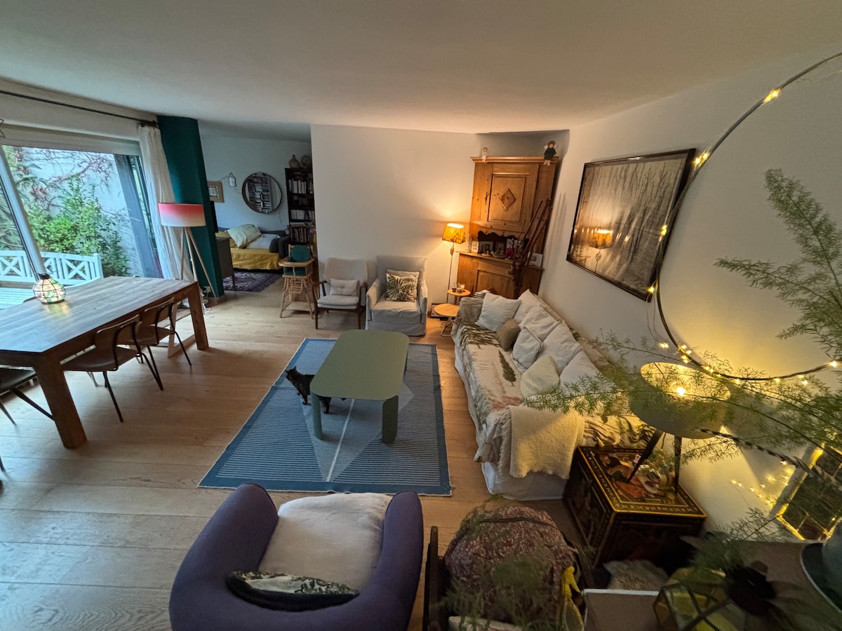 I-Maisonette ngasemva kwegadi ebiyelweyo, phakathi kweParis (35min Notre Dame/car) neVersailles (imizuzu eyi-10/imoto). Indawo yokupaka engabhatalelwayo ngaphandle komnyango I-RERC, yimizuzu eyi-10 xa uhamba ngeenyawo usiya eParis naseVersailles. iivenkile ezinkulu, indawo yokubhaka ,imarike: imizuzu eyi-10 uhamba ngeenyawo. iziko lokuthenga le-velizy2: imizuzu eyi-10 /imoto okanye ibhasi.(Imizuzu eyi-20) Umphezulu: (45.m2) Igumbi elikhulu eliyi-1: ikhitshi, igumbi lokuhlala ,ibhedi enabantu abayi-2 (iimitha eziyi-1,40) Igumbi lokuhlambela eliyi-1: ishawa ,ithobhi I-terrace: itafile, izitulo zokuphumla Amahlathi,Ipuli (imizuzu eyi-2) Masithethe: isiFrentshi,isiNgesi,isiJamani