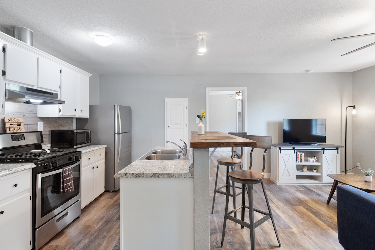 ILa Casita, efaneleke kakuhle xa usebenza naxa uphumle, yindawo yokuphumla yale mihla, eyimfihlo enekhitshi elipheleleyo, umatshini wokuhlamba nowokomisa impahla kwindlu, ne-Wi-Fi ekhawulezayo, nto leyo eyenza ifaneleke kakhulu xa usebenza ukude okanye xa uza kuhlala ixesha elide. Yonwabela iyadi yakho ebiyelweyo, efaneleke kakuhle ukuze uphumle okanye uvumele izilwanyana zasekhaya ezimbini zihambe ngokukhululekileyo. Ikwindawo elula ekulula ukufikelela kuyo kwi-I-35, ukumgama wemizuzu nje embalwa kwiindawo zokutyela, ezokuthenga, nezinto ezinika umdla zasekuhlaleni. Ukubhalisela ukufika kwangethuba nezinto ezongezelelekileyo onokukhetha kuzo ziyafumaneka ukuze uphucule ixesha oza kube ulihleli.