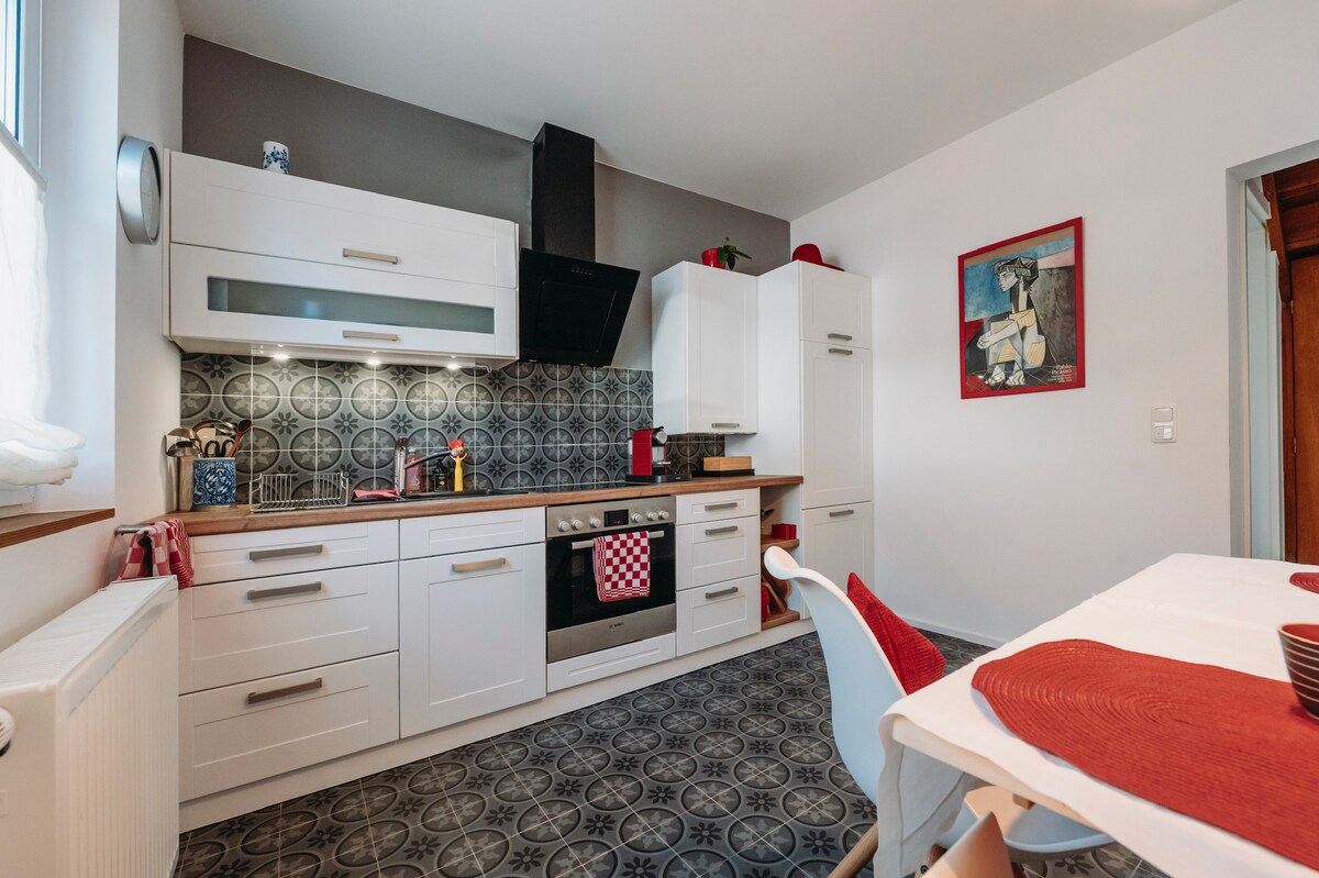 Ibekwe embindini, isandul 'ukulungiswa, inefenitshala entle eyi-60 sqm onokuyisebenzisa ngokwakho. Igumbi lokulala elineebhedi ezimbini (180x200), ibhokisi yeedrowa neekhabhathi kunye neekhethini ezimnyama. Igumbi lokuhlala elinetafile yokutyela nezitulo, isofa, isitulo sengalo neshelfu. Igumbi lokuhlambela lasemini elinebhafu, ithobhi nento yokomisa iinwele Ikhitshi elinesitovu, ioveni, umatshini wokuhlamba izitya, njl. Umgama wokuhamba ngeenyawo: Idolophu endala nombindi oneevenkile zokutyela nemizuzu eyi-2 Isikhululo sikaloliwe (S-Bahn) Imizuzu eyi-8 (imizuzu eyi-20 ukuya kwiFfm) Ipaki ngomzuzu oyi-1 Ihlathi/ibala imizuzu eyi-5
