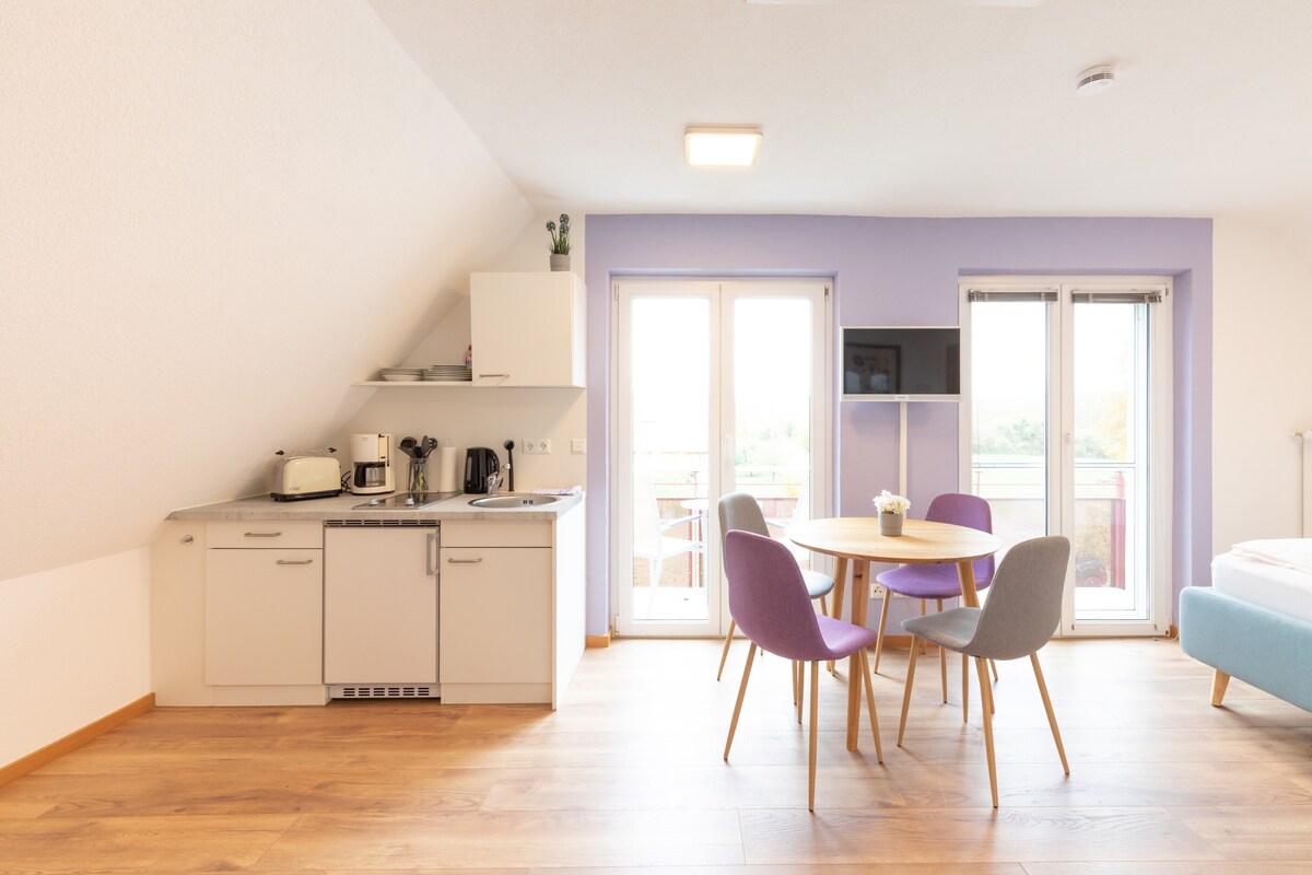 Iflethi entle enamagumbi amabini ( malunga ne-60 ²), eludongeni oluhle kufuphi neHeidelberg. Le flethi inegumbi lokuhlala elikhulu elinendawo yokuhlala, iTV, kunye indawo yokutyela enekhitshi elivulekileyo. Ikhitshi likumgangatho ophezulu kakhulu kwaye lanamhlanje. Kwipaseji eya kwigumbi lokulala, kukho nekhabhathi yokugcina iimpahla. Igumbi lokulala linebhedi elala abantu ababini, kunye nekhabhathi . Ecaleni kweflethi kukho igadi (utshani) enokusetyenziswa.