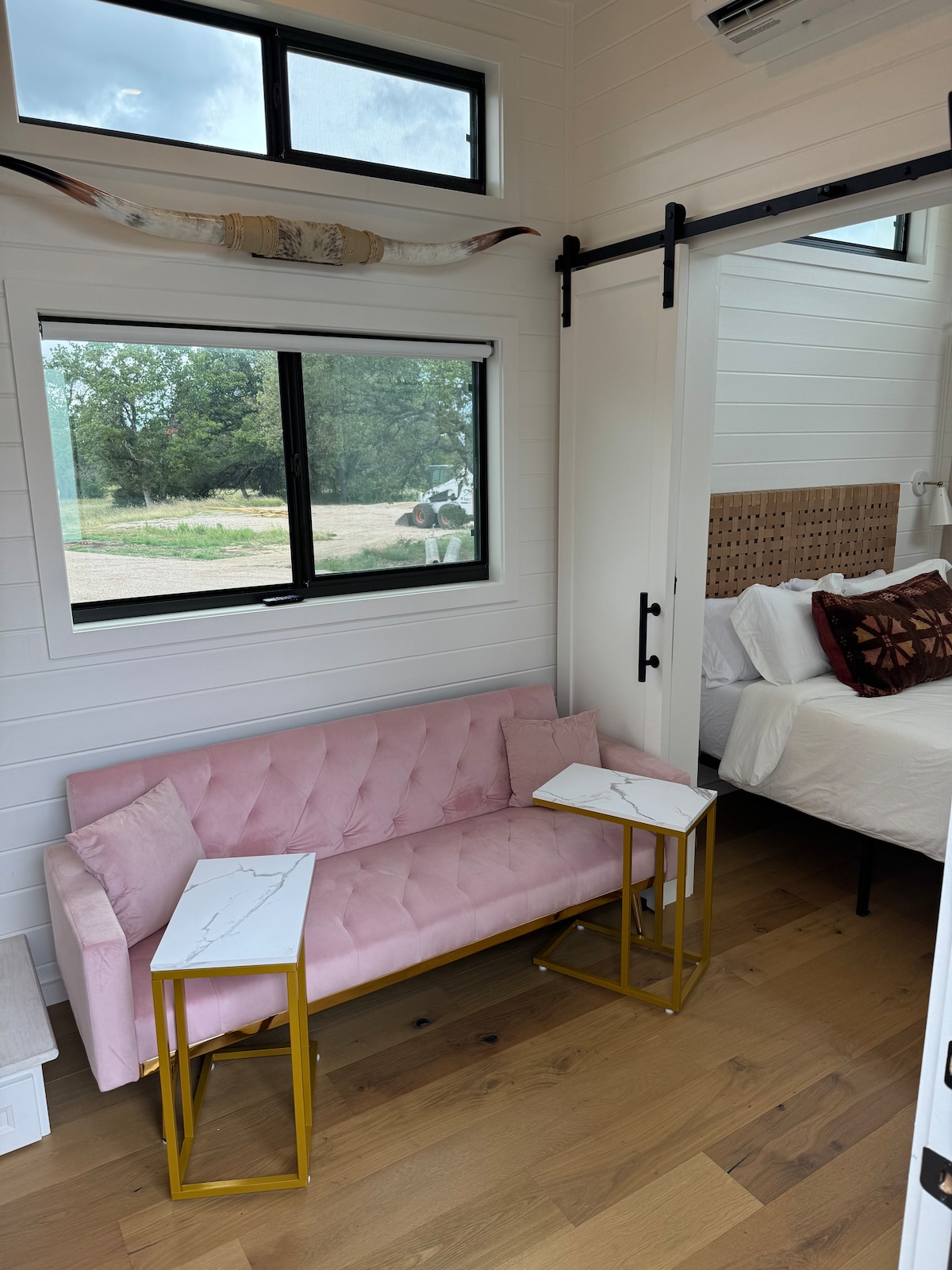 Indlu eyakhiwe emthini (~ 300sqft) iphakathi kwee-oki eziqinileyo eziphilayo kwizulu lethu laseTexas kwimizuzu elishumi ukusuka kwi-Main Street Fredericksburg. Umphakathi wayo otofotofo nohonjiswe kakuhle uquka ibhedi enkulu enamashiti omqhaphu ophilayo, ikhitshi elincinci elicingwe kakuhle, indlu yangasese enendawo yokuhlambela enemvula, indawo yokufunda enendawo yokufunda enefestile ejikelezayo, kunye nebhafu ephandle kumgangatho ophezulu. I-propane grill yakho wedwa ngezantsi. Ukuba awuziboni iintsuku zakho, jonga ezinye izindlu ezakhiwe emthini kwiprofayile yam yombuki zindwendwe!