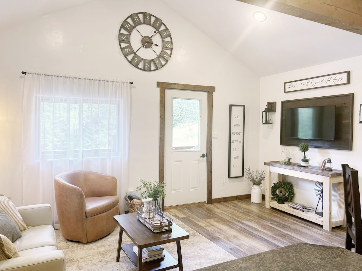 This charming shabby chic and private waterfront cabin is a wonderful place for two people who want to get away from it all! Our romantic Swanky Cabin is newly renovated and features an open floor plan, one loft bedroom with a copper infused cooling Layla queen bed, a full bathroom with shower and washer and dryer. The living room features a wood burning fireplace, unlimited high speed internet, 2 large flat screen TV's, pool table and a large sectional sleeper sofa.