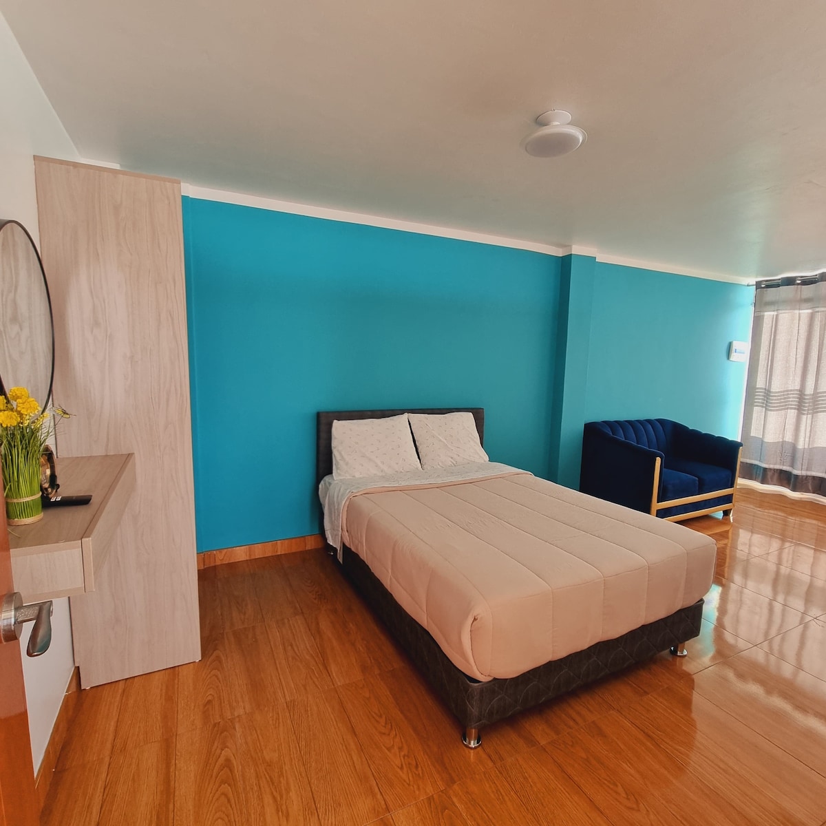 Un lugar relajante a 10 minutos del centro ubicado en zona residencial con seguridad, cuenta con 2 habitaciones cama 2 plazas y 2 camas plaza y media, baño con therma, sala comedor con cómodos y modernos muebles con sofá cama televisores de 44" y 36" zona de lavandería con lavadora, cochera privada dentro de instalaciones, cocina equipada, microondas, refrigeradora dos puertas olla arrocera licuadora y menaje Parrilla, zona de terraza / wifi Ideal para 04 personas sujeto a variación del cliente.