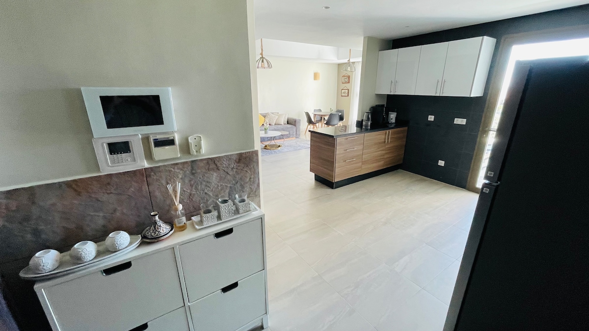 Kwi-400m ukusuka elwandle laseTaghazout, yonwabela iflethi enegumbi lokulala eli-2 enombono wolwandle kunye nokutshona kwelanga okungalibalekiyo. Indawo yokuhlala ethe cwaka nekhuselekileyo, ilungele ukuphumla emva kosuku lokusefa okanye lokukhenketha. Indlu ngaphakathi igqamile, ikhitshi linento yonke, i-wifi ekhawulezayo negumbi lokuhlala elithokomele. Iivenkile zokutyela eziqhelekileyo neevenkile zokutyela ezikufutshane. Indawo efanelekileyo yokonwabela umoya wolwandle nobumnandi baseMorocco.