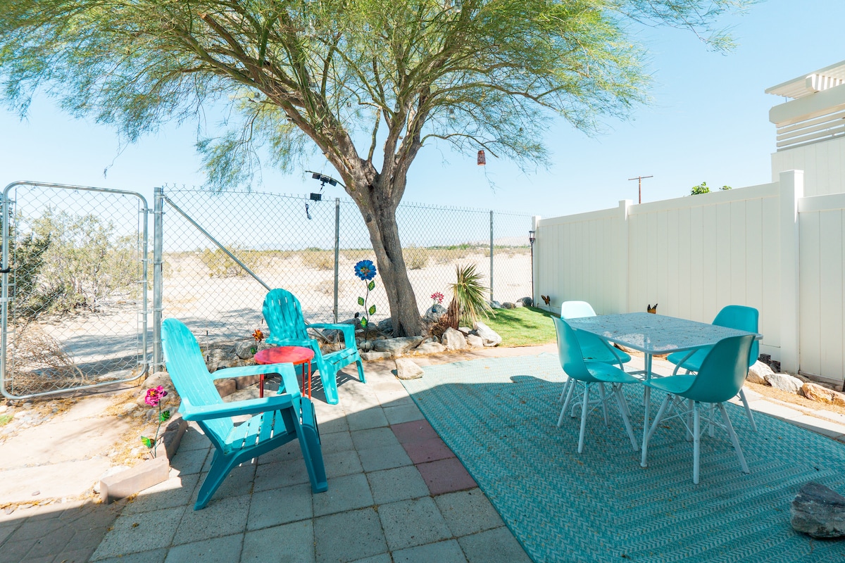 Bhukisha iholide yakho kwindlu esemaphandleni etofotofo yaseJoshua Tree! Ngomtsalane wembali, le ndlu isemaphandleni ihonjiswe ngemithi yePalm noJoshua, le yeyona ndawo ifanelekileyo yokutyelela iJoshua Tree National Park. Indlu esemaphandleni enegumbi lokulala eliyi-1/ibhafu eyi-1 inekhitshi elipheleleyo, izitulo zeBoho swing, kunye neendawo ezininzi zokuphumla phandle. Kwiimayile nje eziyi-6 ukusuka kumnyango waseMpuma weJoshua Tree National Park nemayile eyi-1 ukuya kwiTwentynine Palms's Freedom Plaza esandul 'ukwakhiwa enemarike yabalimi qho ngoMgqibelo. Bhukisha indawo oza kuhlala kuyo ngoku!