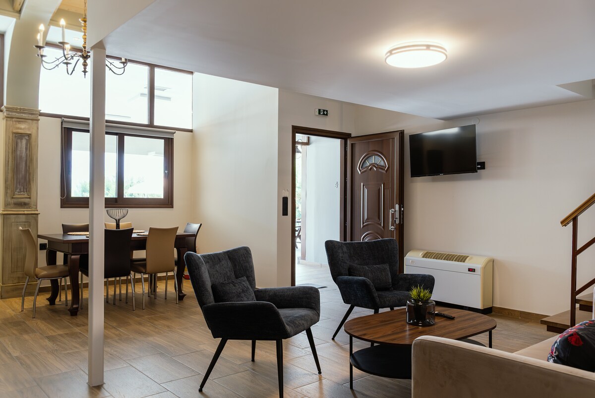 Iflethi evulekileyo nekhanyayo enokufudumeza okuzimeleyo, amanzi ashushu iiyure eziyi-24 ngosuku kunye neyadi, ikwenza uhlale kamnandi kwindawo etofotofo nethuleyo ekwiikhilomitha eziyi-4 ukusuka embindini weIoannina nakwidolophu endala. Ifumaneka kwishishini kwiYunivesithi nakwiSibhedlele saseYunivesithi, kuba ikumgama omalunga [neekhilomitha eziyi-5 ibe akukho mfuneko yokuba uwele isixeko kwaphela. I-intanethi inesantya esivela kwi-200-300 Mbps (i-satellite).