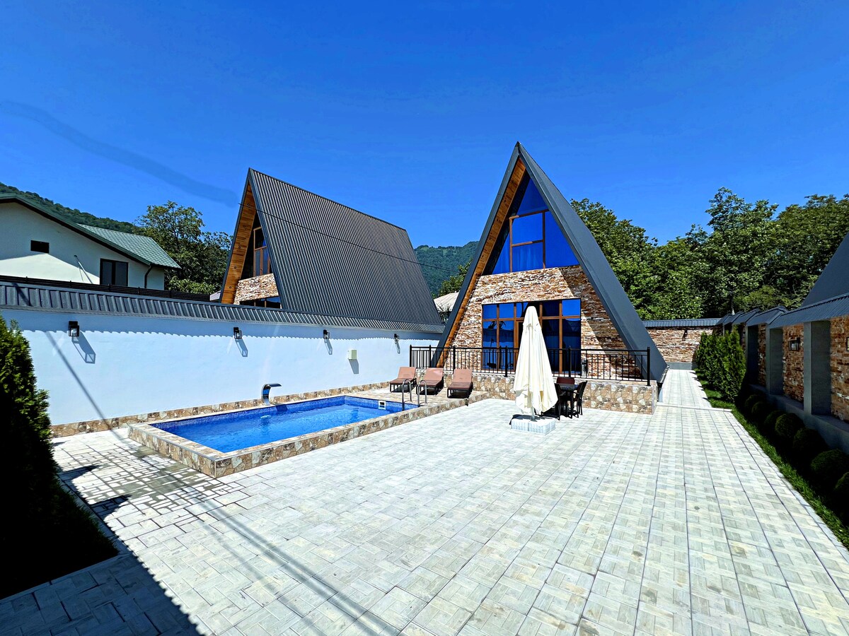 Le ndlu yamaplanga inamagumbi ayi-5 atofotofo namagumbi okuhlambela ayi-5, ilungele ukulala iindwendwe eziyi-12. Igumbi lokuhlala elikhulu elineefestile ezinkulu likunceda ukwazi ukubona kakuhle iintaba nepuli. Le ndlu inepuli ezimbini zokubhukuda: enye ifudumele esitratweni, enye ipholile ngaphakathi endlwini. Le ndawo ikwindawo ekuthiwa yiCaucasus, imizuzu eyi-5 kuphela xa uhamba ngemoto ukuya kwiindawo ezibalaseleyo. Yindawo efanelekileyo yeholide engasoze ilibaleke kunye nentsapho nabahlobo ejikelezwe ziintaba nomoya ohlaziyayo.