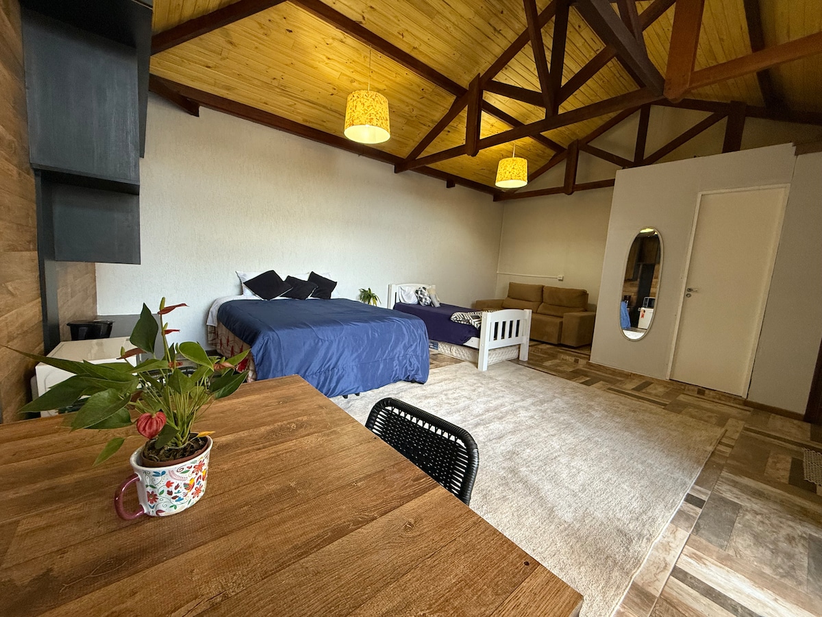 Confortável suíte/estúdio, 28 m2, com entrada independente da casa e linda vista. Espaçosa, acomoda confortavelmente até 4 pessoas. Conta com infraestrutura para o preparo de pequenas refeições. Roupa de cama e banho, além de cobertores e edredons, perfeitamente higienizados. Internet com fibra ótica de alta velocidade. Tv com 80 canais. Localizada no Alto do Capivari, cerca de 2km e meio, do centro turístico. Acesso fácil, com apenas 600mts em rua de terra batida, saindo do asfalto.