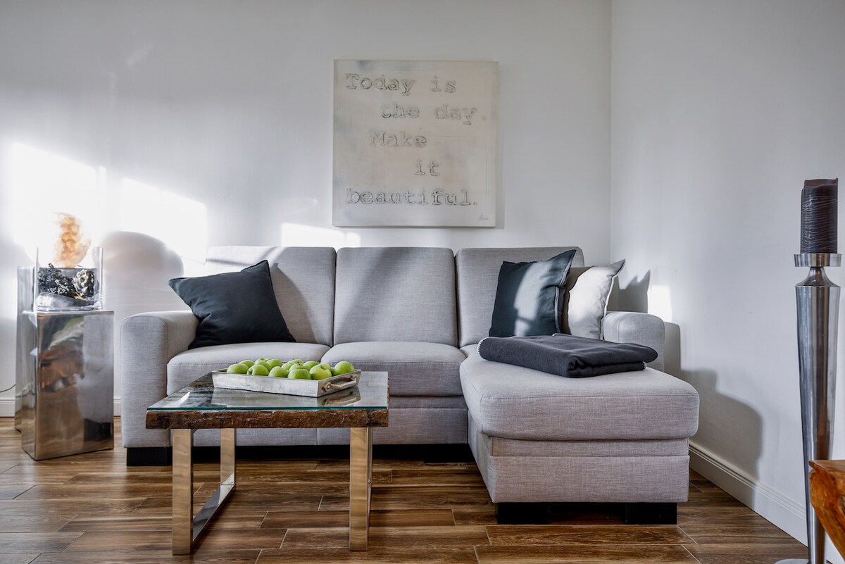Iflethi yethu esemgangathweni eyi-70 m² enophawu lwendlu enye ikunika indawo yokuhlala/yokutyela eyi-40 m² enekhitshi elivulekileyo, indawo yokutyela nendawo yokubasa umlilo, indawo yeofisi, igumbi leshawa elineshawa, igumbi lokulala elahlukileyo, igumbi lokulala elahlukileyo, ithala elikhulu eligqunyiweyo eline-sauna negadi evulekileyo. Ulwandle, idolophu kunye nesikhululo sikaloliwe sinokufikelelwa ngeenyawo malunga nemizuzu eyi-10 ukuya kweyi-15, ivenkile ekufutshane imalunga ne-250m kude. Izinja zamkelekile!
