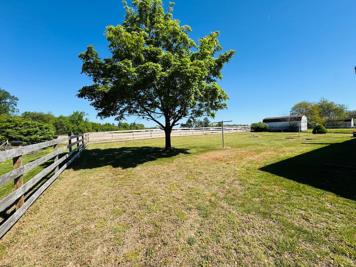 Phola kunye nentsapho yonke kule ndawo yokuhlala ithuleyo efama. Uza kubona amahashe, iinkomo, iibhokhwe, iinkukhu namadada. Ilungele intsapho. Izilwanyana zihambahamba endlini kwaye zikhuselekile ukuba nezilwanyana zasekhaya. Uza kuva iingxolo ezininzi zasefama ezifana nokukhala kweentakumba, iinkomo ezikhalayo nokunye. Le ndawo ikweli lizwe ibe ingaphantsi kweemayile eziyi-5 ukusuka kwiivenkile nokuthenga. Ikhitshi elipheleleyo, igumbi lokuhlambela eliyi-1 nebhedi enkulu eyi-1 iqukiwe. Xa ucela i-Queen Air Mattress okanye i-Twin Bed ungayifumana.