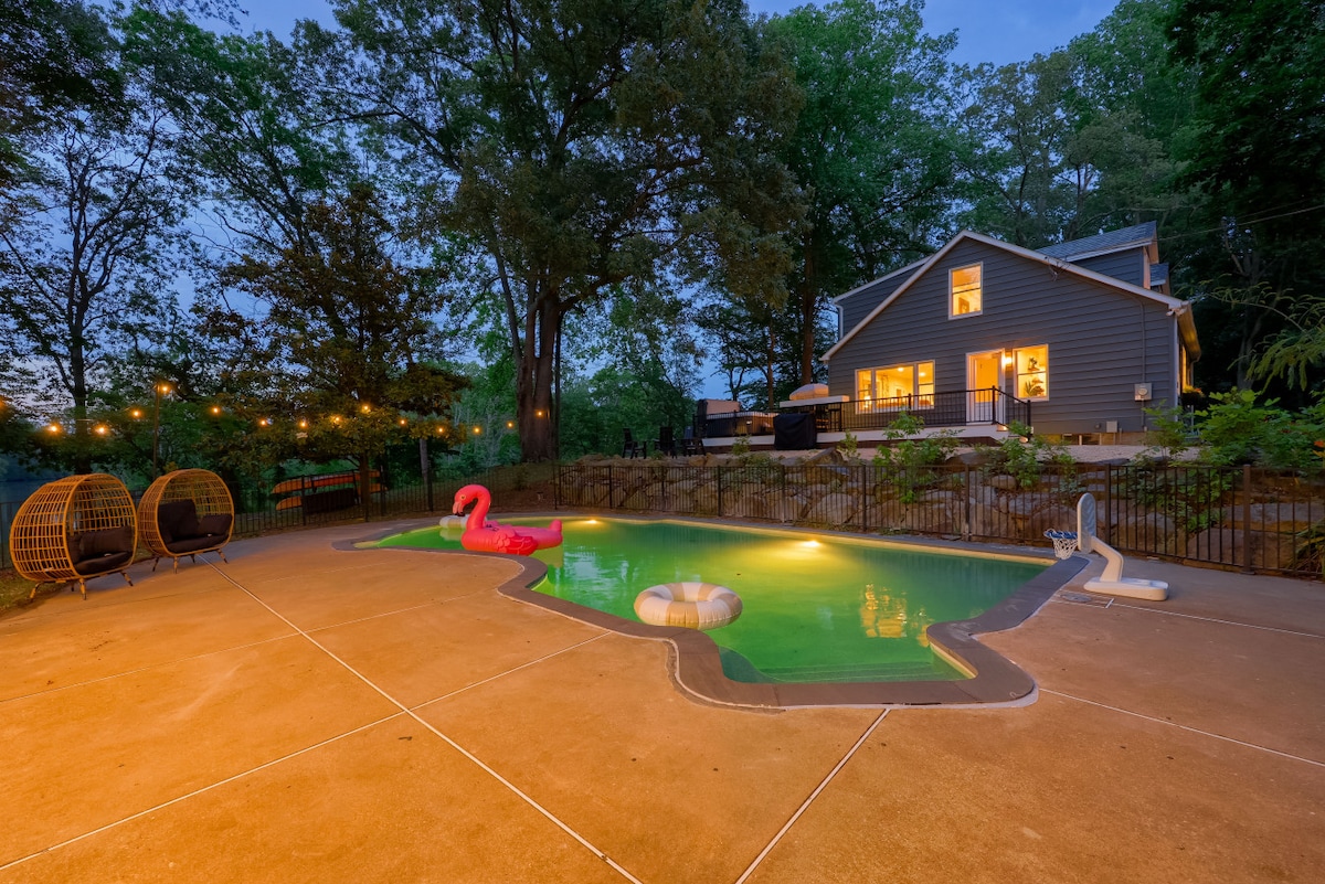 Welcome to this secluded waterfront oasis with a Heated SALT WATER POOL, CABANA, HOT TUB, BEAUTIFUL master suite, and kayaks! Come and make memories with your family and friends or enjoy a ROMANTIC getaway WITH YOUR SPOUSE, HIGHLIGHTS POOL HOT TUB BREEO FIREPIT ESPRESSO MACHINE This newly renovated cottage with a pool is located on the banks of a river and has lovely water views and has a luxurious master suite with a king bed and a bathroom with a double vanity and a luxury tile shower.