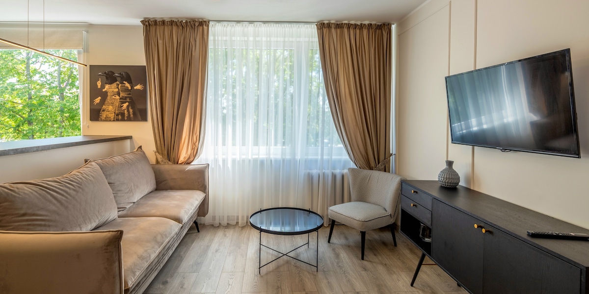 Iflethi yethu evulekileyo, esandul 'ukulungiswa, etofotofo necocekileyo eyi-108 sq. m. ikwindawo esembindini wesixeko, kwisakhiwo esidala sembali esijikelezwe zizindlu zembali ezixabisekileyo ngesitayile sezakhiwo zaseJamani. Le flethi ikumgama wemizuzu eyi-15 ukuya kweyi-20 xa uhamba ngeenyawo ukusuka kwidolophu endala, kwizikhululo zebhasi neetreyini, imizuzu eyi-5 ukusuka kwipaki yokuzonwabisa kunye neendlela zebhayisekile, imizuzu eyi-10 ukusuka kwindawo yokuthenga. Ulwandle lwaseMelnrage lumalunga nemizuzu eyi-20 xa uhamba ngehlathi okanye imizuzu eyi-5 ngemoto.