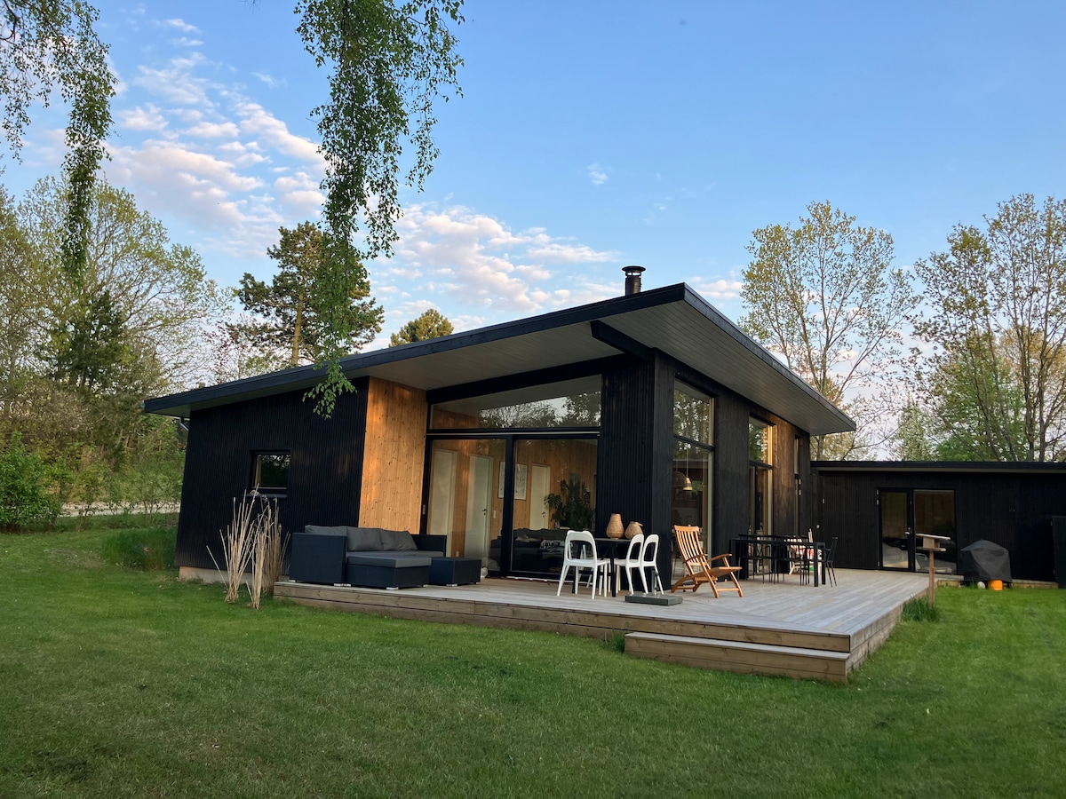 Indlu entsha esemaphandleni enobunewunewu eyi-115 m2, eneemitha eziyi-80 ukuya elunxwemeni olulungele abantwana. 3 amagumbi okulala amakhulu. kunye 2 lokuhlambela elihle. 50 m2 igumbi lokuhlala elikhulu elinekhitshi elinesinki/umatshini wokuhlamba izitya, itafile yokutyela enendawo ye-10 pers. indawo yokuhlala etofotofo, isitovu esitshisa iinkuni kunye ne-loft enkulu enendawo yokubuka ulwandle. icandelo londwendwe linendawo yalo yokungena negumbi lokuhlambela. Ngaphandle kukho ithala elikhulu elinendawo yokuhlala kunye nelanga/ukukhanya ukususela kusasa ukuya ngokuhlwa. Le ndlu ikwindawo eninzi, esemaphandleni etofotofo. Ilungele izizukulwana ezi-3, okanye abahlobo ababini kunye nabantwana