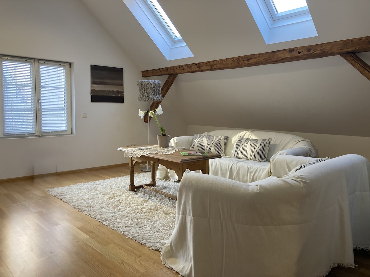 Die renovierte Ferienwohnung ist mit neuen Möbeln ausgestattet und besticht durch ihre helle und freundliche Atmosphäre. Sie bietet Platz für 3 Personen. Wenige Minuten zu Fuß entfernt finden Sie den malerischen Rhein, der zu entspannten Spaziergängen oder Fahrradtouren einlädt. Die Umgebung bietet zahlreiche Radwege, die Sie in die umliegende Natur führen. Der Bus befindet sich in direkter Nähe. Die Wohnung ist mitten im Dorfkern neben einer Bäckerei (7 Tage offen) und einer Metzgerei.
