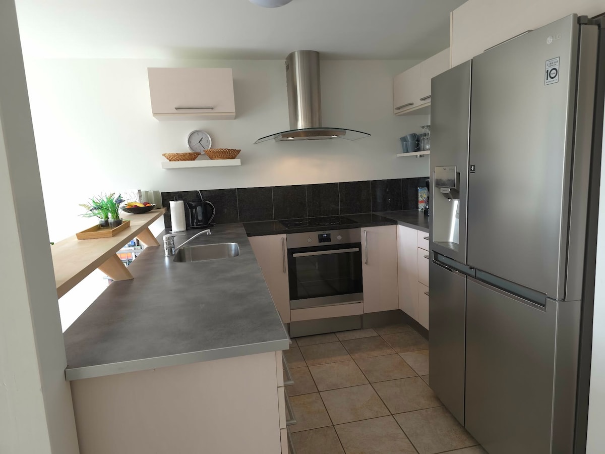 Le flethi imalunga ne-100m2 enomatshini okhupha umoya obandayo okanye oshushu. Igumbi lokuhlala elitofotofo elinemidlalo yebhodi, isofa, iPS4, i-smart TV nayo yonke into oyidingayo ukuze upheke. Kukho umatshini wokuhlamba izitya. Sinamagumbi ayi-3 amahle nawasandul 'ukulungiswa aneebhedi zabantu abadala abayi-5, kunye nebhedi yosana nebhedi yempela-veki yabantwana. Sinezinja eziyi-3 nekati eyi-1, ibe izilwanyana zasekhaya zamkelekile ukuba nje zilawulwa ibe azikho ebhedini. Sisebenzisa indlu yangasese kunye ebusuku, kodwa enye indawo yeyakho 100%.