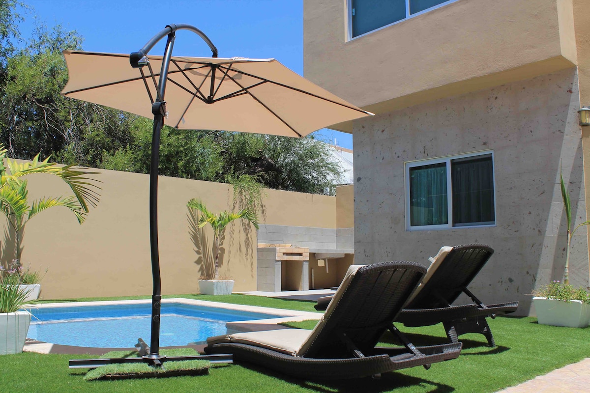 Indawo entle kwindawo esembindini. Imizuzu eyi-15 xa uhamba ngemoto usuka kwindawo yokuhamba ebhodini (eMalecon), imizuzu eyi-15 xa uhamba ngemoto usuka kwisikhululo seenqwelo-moya saseLa Paz ibe yimizuzu eyi-2 xa uhamba ngeenyawo usiya elwandle. Iivenkile zokutyela ezintle nekhemesti kwimizuzu eyi-2 uhamba ngeenyawo usuka endlini. Amagumbi okulala amakhulu ayi-2 negumbi elongezelelekileyo elinebhalkhoni phezu kwegaraji evaliweyo ebonakala elwandle! Amagumbi okuhlambela ayi-3.5 neshawa yangaphandle yepuli. Le ndawo ikhuseleke kakhulu kwaye izolile enkosi ngokucinga kwakho!