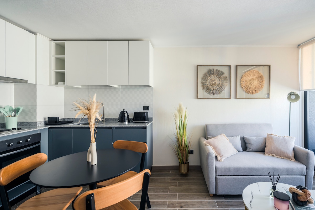 Yonwabela isitudiyo sethu esisembindini weConcepción, kufutshane neeyunivesithi, izithuthi, iivenkile ezinkulu neevenkile zokutyela. Ifanele abantu ababini, iflethi okanye indlu ekwicomplex iquka ibhedi eneendawo ezimbini, ikhitshi elinento yonke, igumbi lokuhlambela elinebhafu, i-smart TV netafile yomsebenzi/yokutya. Esi sakhiwo sinejimu, igumbi lokusebenzela, igumbi lokuhambisa impahla, igumbi lokuhlamba iimpahla, ii-quinchos ze-panoramic kunye nendawo yokuphumla. Ukuba lula nokuhlala kamnandi kwindawo esembindini!