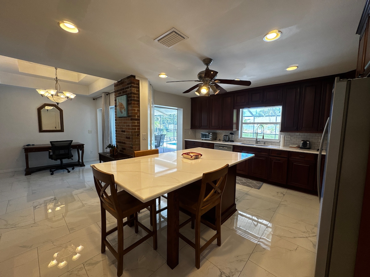 Wamkelekile kwiOasis yakho yabucala, eneyadi enkulu engasemva egcwele imithi yeziqhamo nepuli yamanzi anetyuwa ehambelana nendawo entle, kwimizuzu nje embalwa ukusuka eNokomis Beach, kunye neLegacy Trail. I-Casperson Beach, abazingeli bamazinyo ookrebe baphupha, yimoto emfutshane eya kwisiqithi saseVenice ukuze wonwabele iVenice Beach kunye neevenkile ezintle zasekuhlaleni kunye nokutya okanye ukhwele uhambo olufutshane ngasentla ukuya eSiesta Key Beach, #1 Beach yaseMerika, kunye neSiesta Village enikezela ngokuthe ngqo elwandle kunye neevenkile ezintle zasekuhlaleni kunye nokutya.