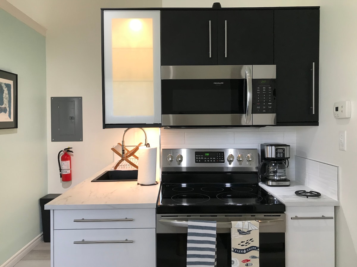 Iflethi okanye indlu ekwicomplex yale mihla kwisakhiwo esinembali e-Eastport Maine. 460 sq ft enomgangatho wabucala, ibhedi enkulu, indawo yokuhlala w/isitovu segesi, ikhitshi le-galley negumbi lokuhlambela. Indawo yamabali yesibini ehamba ngaphandle ijonge iyadi enkulu ibe inetafile, iambrela nezitulo zokutyela phandle okanye ukonwabela nje usuku. Indawo yakho yokungena nendawo yokupaka engekho esitratweni. Ikhitshi elinento yonke w/ ifriji/ifriji, i-Keurig, iketile, i-toaster oven, izinto zokupheka, iimela, izitya, izitya, izitya zesidlo sangokuhlwa. Ikhabhathi enkulu enomatshini wokutshayela nehitha.