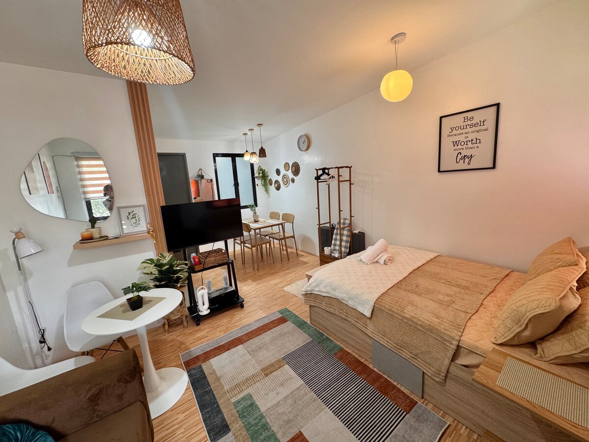 Ukuba lula kudibana nentuthuzelo kwiflethi yethu etofotofo ye-40 sqm studio, ekufutshane neClark Airport. Zonwabise kwindawo ephucukileyo yeClark Freeport Zone kunye neendawo ezijikelezileyo ezinoxolo kunye neentaba kwibhalkhoni yayo yabucala. Ukufikelela lula kwiikhasino ezikufutshane, iivenkile zokutyela, iikhefi neendawo ezithandwayo zabakhenkethi. Nokuba ulapha ngezoshishino okanye ukuzonwabisa.