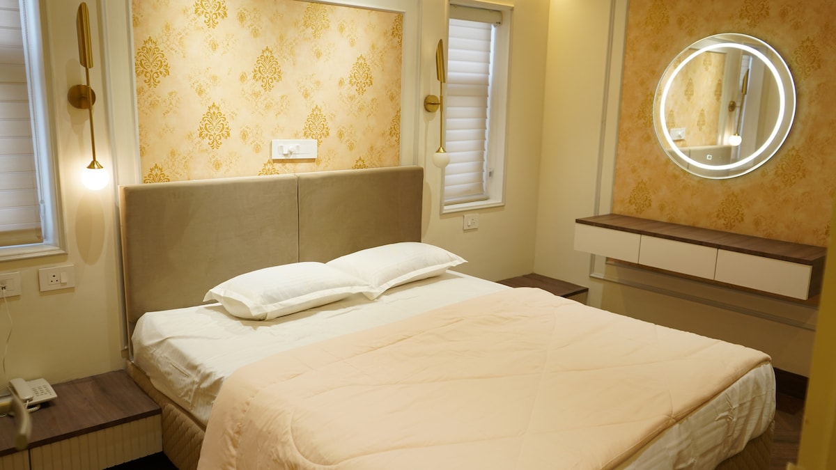 Our Standard Double Room with AC is perfect for couples or two guests looking for a cozy and comfortable stay. The room features a king-size bed, split air conditioning, a wardrobe for your belongings, and an attached private bathroom. With all essential amenities and fresh linens provided, it ensures a relaxing and pleasant experience. Ideal for both business and leisure travelers, this room offers a perfect balance of comfort and convenience. to explore is right outside the door of this place.
