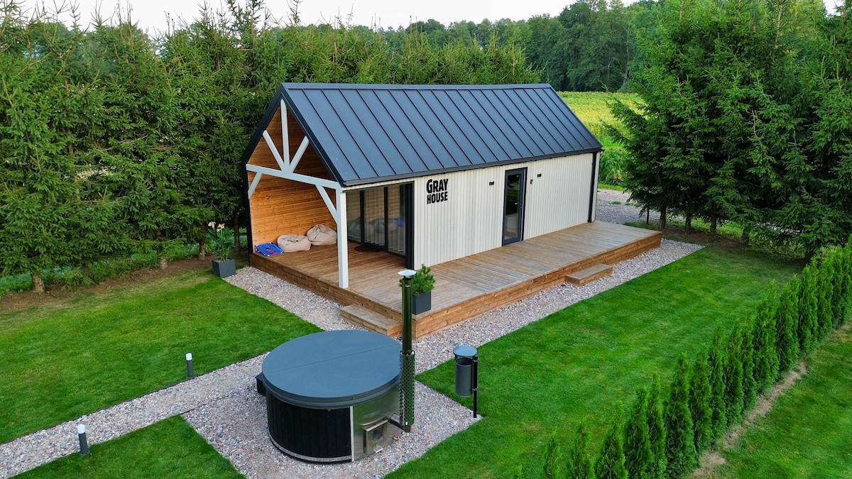 Indlu entsha yamaplanga eyi-75 sq metres apho igumbi lokulala, igumbi lokuhlala elinekhitshi, igumbi le-wc. Iindwendwe zinikwa i-terrace enkulu enefenitshala etofotofo, kukho indawo entle yokosa, ibhafu enamanzi ashushu kule ndlu. Le ndlu inokuthatha abantu abayi-5. Le ndawo yokuhlala ilungele abahambi bamanye amazwe, emva nje kokungena eLithuania usuka ePoland. Abantwana balungele i-swings, i-sandbox, i-trampoline, i-ball pool, i-go-karting. ILake Oria inokufikelelwa kwiikhilomitha eziyi-7 ukuze ifikeleleke lula kubantu abadala nabantwana. Kusifowunela.