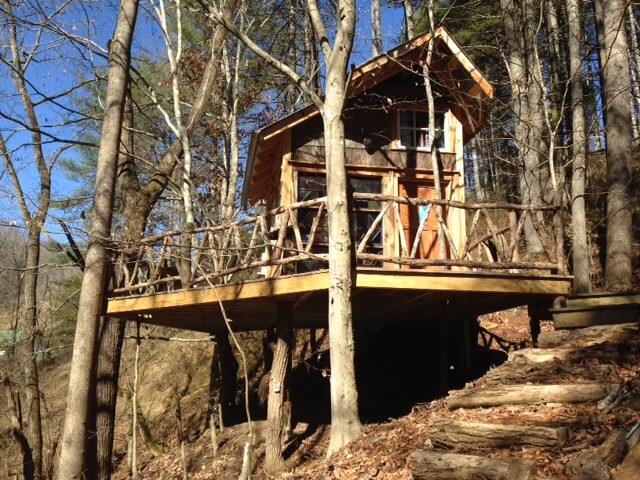 Indlu eyakhiwe emthini eyi-10ftx10ft eyakhiwe ijikeleze umthi we-hickory onomgangatho weplanga. Ijonge phezu komlambo oyi-30 feet ngezantsi. Kukho iiswitshi zombane/iindawo zokuphuma kunye nefeni/isixhobo sokufudumeza ioyile. Nyuka ileli uye kwi-loft yokulala enebhedi eqhelekileyo enobukhulu obupheleleyo. I-loft inencopho ephakamileyo ngokwaneleyo ukuba ingama phantsi kwayo. Pheka phandle kwi-grill yegesi. Akukho manzi ahambayo kodwa kukho isixhobo sokuhambisa amanzi okusela. Igumbi lokuhlambela yindlu yangasese enomgquba neshawa yangaphandle enetanki lelanga ekupheleni kwendlela eyi-25ft, ecaleni kwendlu eyakhiwe emthini.