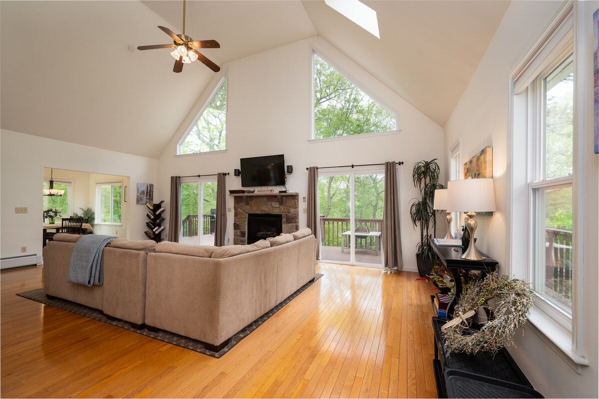 Phola uze wonwabele ukuhlala kwindawo yethu evulekileyo yaseMasthope Mountain kufutshane noMlambo opholileyo waseDelaware! Kuba kukho imigangatho eyi-3 yendawo yokuhlala ekwingingqi enamaplanga eMasthope, ngokuqinisekileyo kukho indawo eyaneleyo yokuba intsapho yonke ifumane umoya ococekileyo kunye neR&R encinci kude nokuxakeka kwesixeko! Eli ligumbi lokulala eli-3 (kunye nendawo yokulala eyongezelelekileyo kwigumbi elingaphantsi), igumbi lokuhlambela elipheleleyo eliyi-3, elinendawo yokubasa umlilo, idekhi enkulu enendawo yokubraya, indawo yokubasa umlilo yegesi, iTV yesikrini esikhulu nomgangatho ovulekileyo.