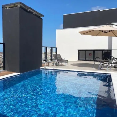 Khawube nombono wokuhlala kwiparadesi encinci, ekude nendawo ephithizelayo, ukuze uphole uze wonwabele ukubuka ulwandle ngendlela entle. Le flethi yinxalenye ye-Smart Costa Azul condominium, indawo entle nephawulekayo kule ndawo. Ikwiikhilomitha eziyi-12 ukusuka edolophini iMatinhos. Sinebhalkhoni negumbi eliphambi kolwandle, i-panoramic terrace enepuli engapheliyo, indawo yokupaka ngaphakathi simahla, ilifti, iishawa zangaphandle nendawo yezilwanyana zasekhaya.