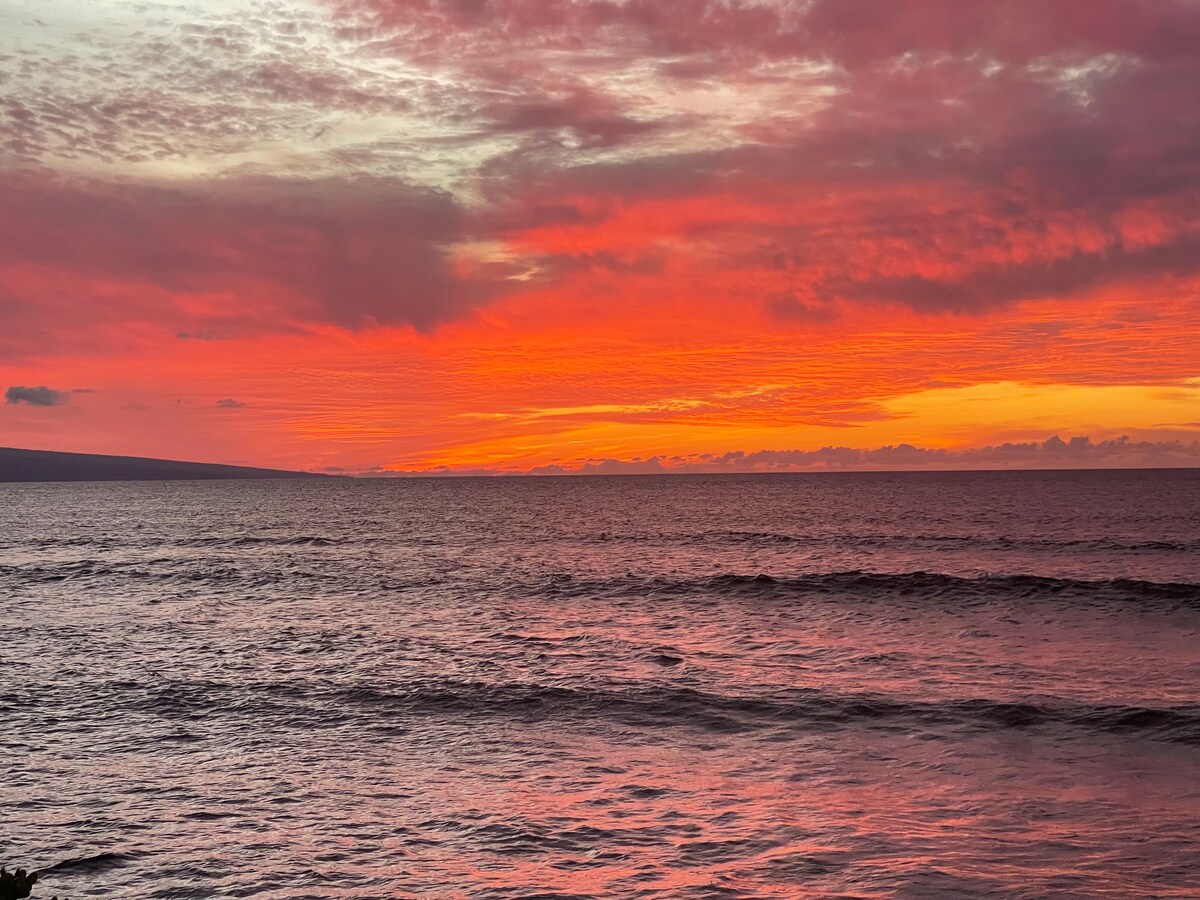 Yonwabela ukubuka indawo enkulu-olwandle kunye ne-2 Islands-amafu nemikhomo ngexesha lonyaka kwi-lanai yakho enkulu, eyi-150 square ft YABUCALA kunye ne-condo eyi-900 square ft. Imizuzu eyi-4 xa uhamba ngeenyawo usiya eKamaole 1, (Kam 1) ulwandle olukumgangatho wehlabathi olune-snorkeling, i-SUP, ne-boogie boarding, olunezitepsi zokuqeshisa ngeempahla. Imizuzu eyi-3 ukuya kweyi-15 xa uhamba ngeenyawo usiya kuzo zonke iivenkile zokutyela zaseS Kihei, iilori zokutya, iivenkile neebhari, yidolophu engaselwandle ephantsi nje kwendlela yokungena imoto. Ipuli enamanzi ashushu, ibhafu enamanzi ashushu, i-sauna neendawo zokubraya eziyi-2! Ayikho ngaphezu kwabantu abadala abayi-4 nabantwana abayi-2.