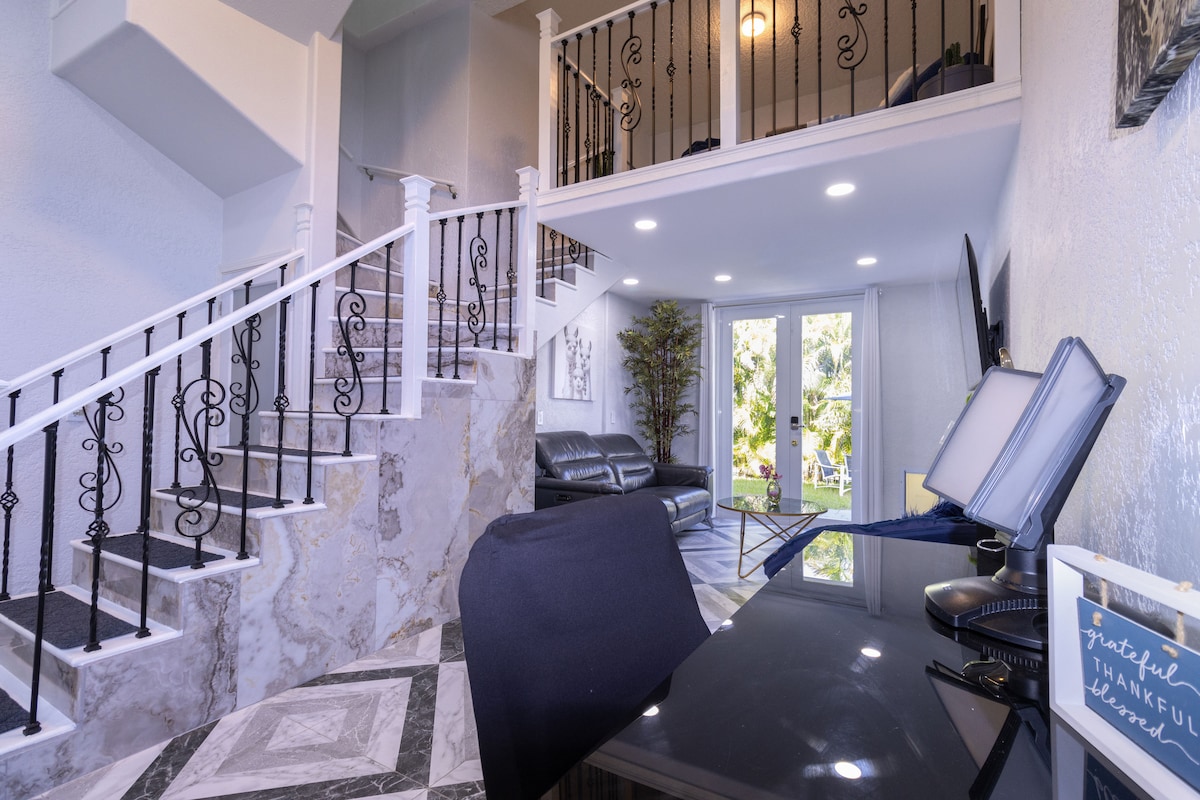 🛜I-500mbps neWiFi 🏠Indawo yakho wedwa nendawo yakho yokungena 🌴I-Hammock Swings ☀️ Iveranda Yangaphandle 🦩Ibhafu Enamanzi Ashushu Yabucala 🥑Ikhitshi elincinci/ipleyiti eshushu yombane 😴I-King Size Bed Loft Idesika 📚Yomsebenzi 📺 I-smart TV + Roku yee-intshi eziyi-55 ❄️ Ingqele A/C Indawo yokupaka 🚘 eyi-1 QAPHELA: Ukungena ebhedini kufuneka unyuke ileli. Ngoxa iqinile kwaye ikhuselekile, isenokungazilungeli iindwendwe ezingakwazi ukuhamba kakuhle, ngoko nceda ucinge ngale nto ngaphambi kokuba ubhukishe.