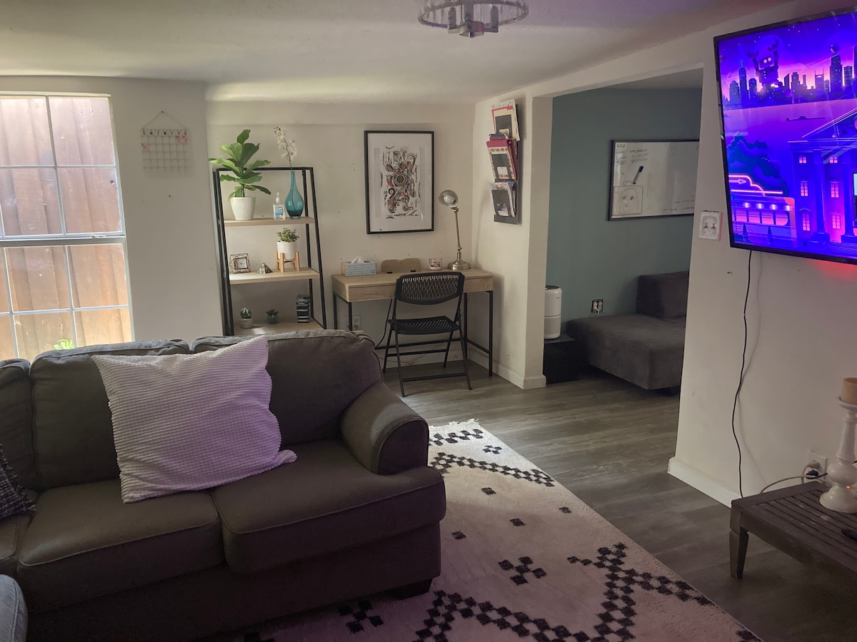 Right in the heart of Allen, this peaceful getaway is a small piece of luxury in the most ideal location! The 1-bath boasts all the basics, including a Smart TV, WiFi, and a cozy setting to relax. When you’re not shopping at the Outlets, spectating at the Events Center, or taking a scenic stroll on the creek trail — The space is all you need for a calm retreat. The studio is attached to the main home but is a completely separate unit, with its own private entrance and easy parking.