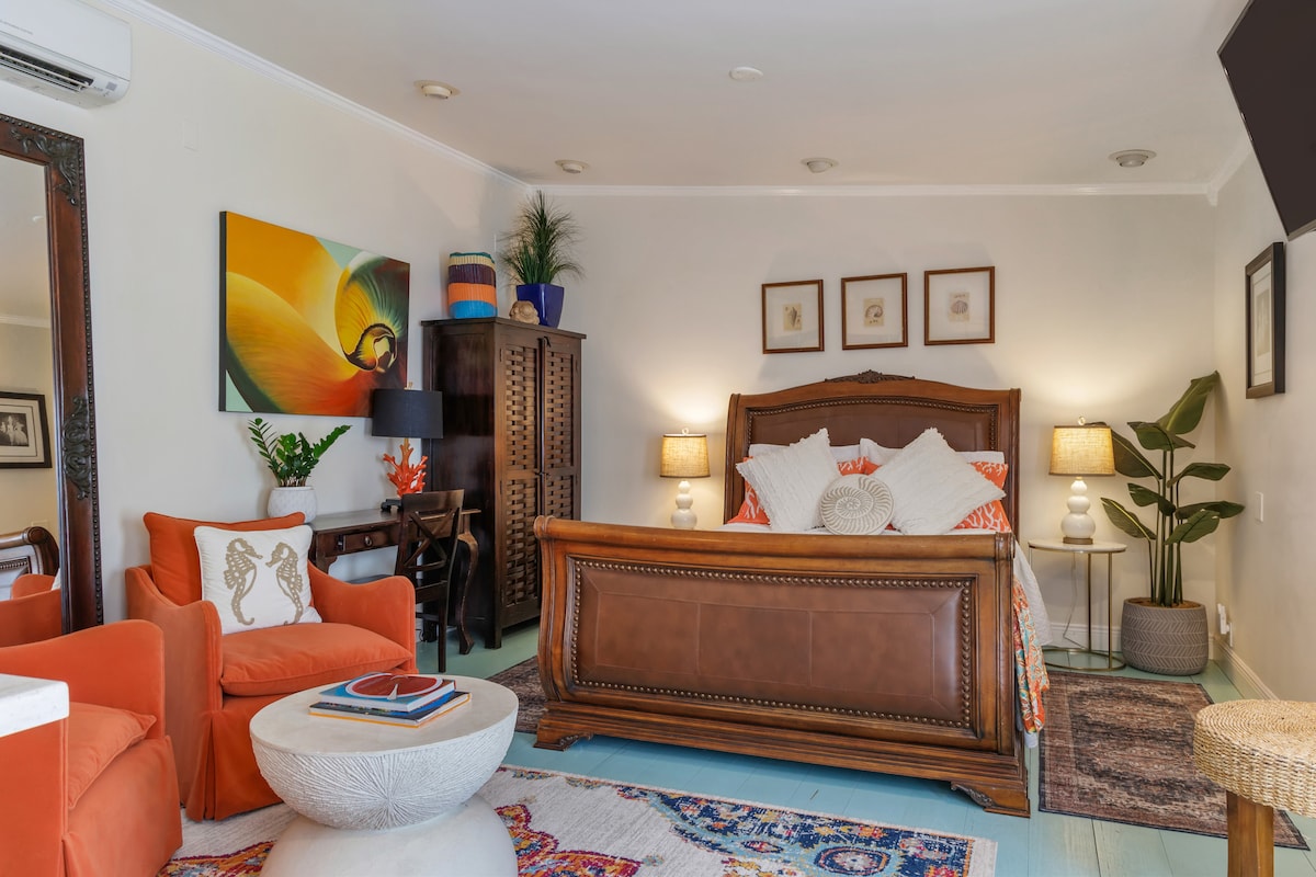 *Ukuhlaziywa kwakutshanje (2025): Senze ukuphuculwa okumangalisayo kwigumbi lokuhlambela le studio â ngoku livalwe ngokupheleleyo neendonga ezandisiweyo ukuya kwisilingi kunye nefeni entsha yokukhupha umoya. Ikwindawo ephakathi kwisithili saseCuba, ikufutshane nendawo yokutyela eyaziwa ngokuba yeyona ikhulu kakhulu eKey West, le flethi ekhanyayo nenomoya opholileyo ikufutshane nayo yonke into ekwesi siqithi. Akukho mfuneko yemoto â iibhayisekile nezitulo zaselwandle zifumaneka simahla ukuze ukwazi ukuhamba ngesantya sakho.