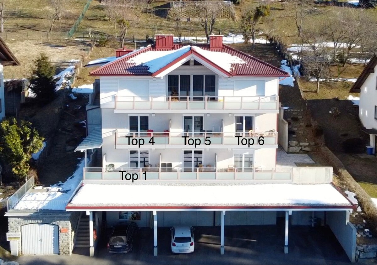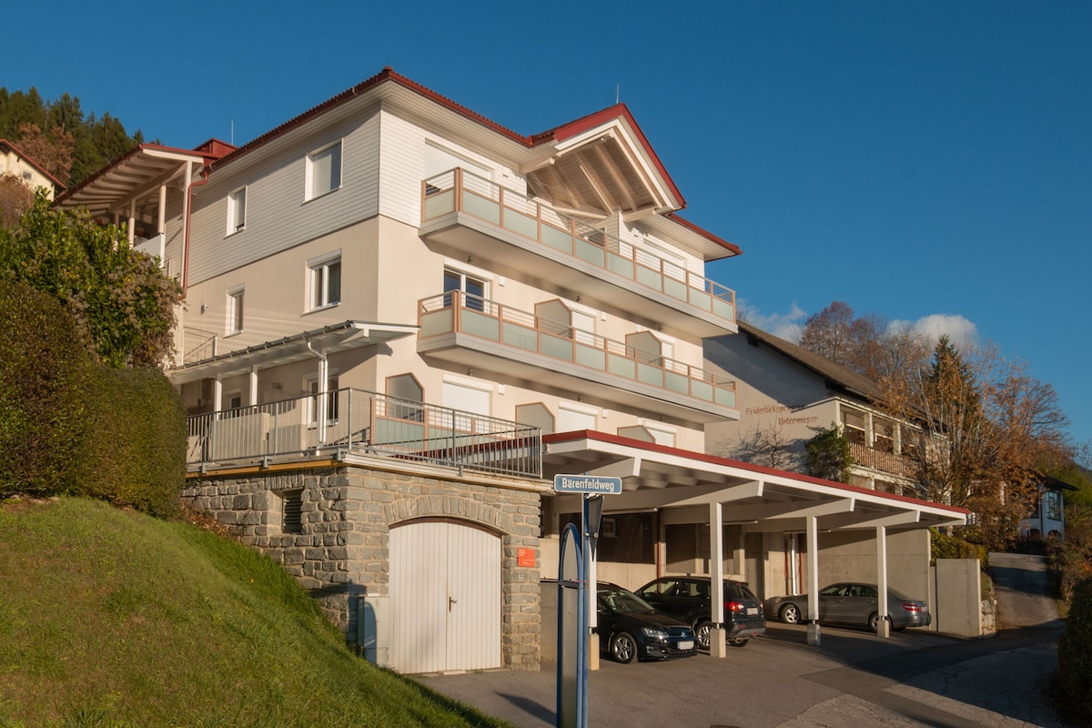 Iflethi okanye indlu ekwicomplex entle embindini weMillstatt nenendawo entle yokubuka ichibi. Inefenitshala esandul 'ukufumaneka negumbi lokuhlambela/indlu yangasese eyongezelelekileyo, ikhitshi, i-anteroom kunye nendawo enkulu yokuhlala/igumbi lokulala. Ibhalkhoni enkulu enefenitshala yokuthamela ilanga neetshona zelanga. 2 Mounteinbikes