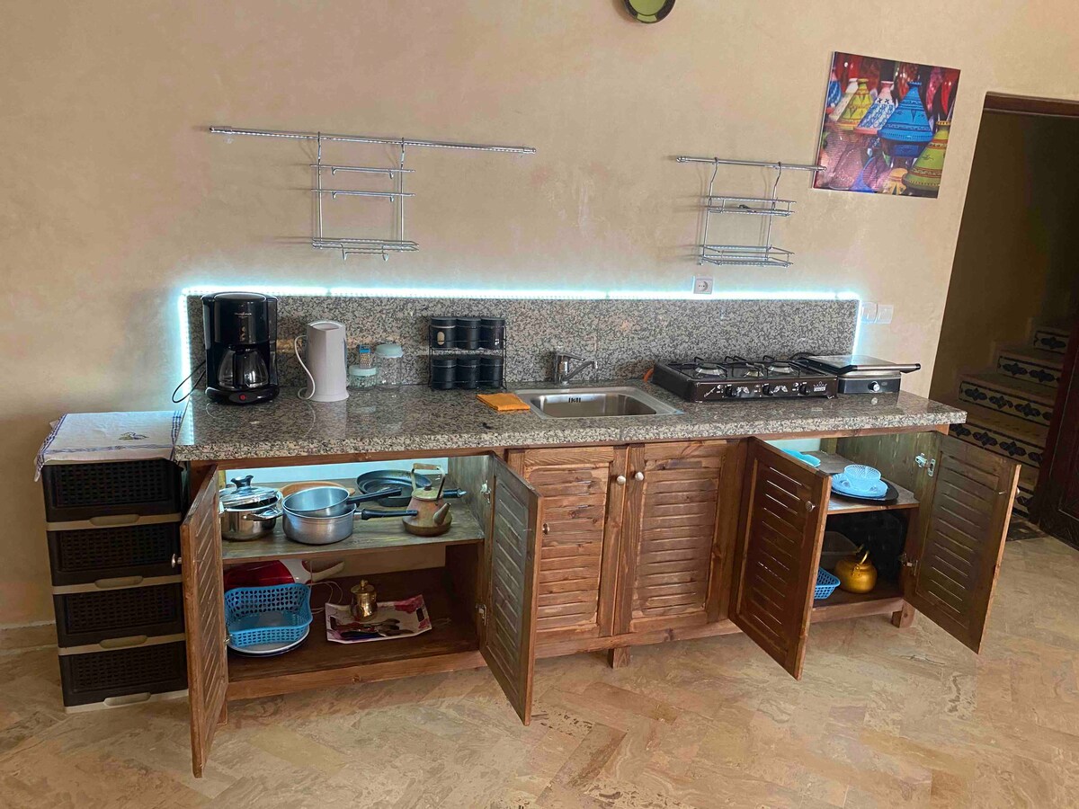 110 m² Umgangatho omdala oqhelekileyo onezixhobo ezipheleleyo. Endleleni yaseBerber yaseMorocco. I-Wood Stock House yindlu yabucala engaselwandle, kanye kwintlabathi enegolide yaseAftas Beach kummandla weMirleft Town kumazantsi eMorocco.