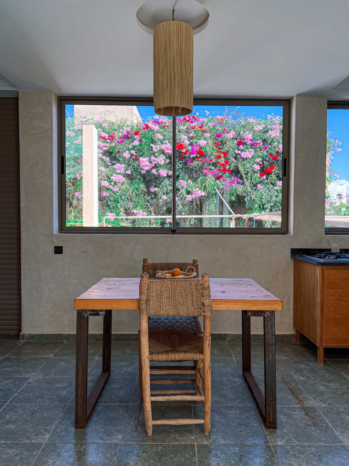 Welcome to Tigiz Apartment, named after Tigiz, which means “House of Roots” in Tachelhit. This open-plan apartment is perfect for a couple with one or two children. Large windows fill the space with beautiful Moroccan light, and the interior features handcrafted décor and elegant tadelakt walls, giving the apartment a natural, warm atmosphere.