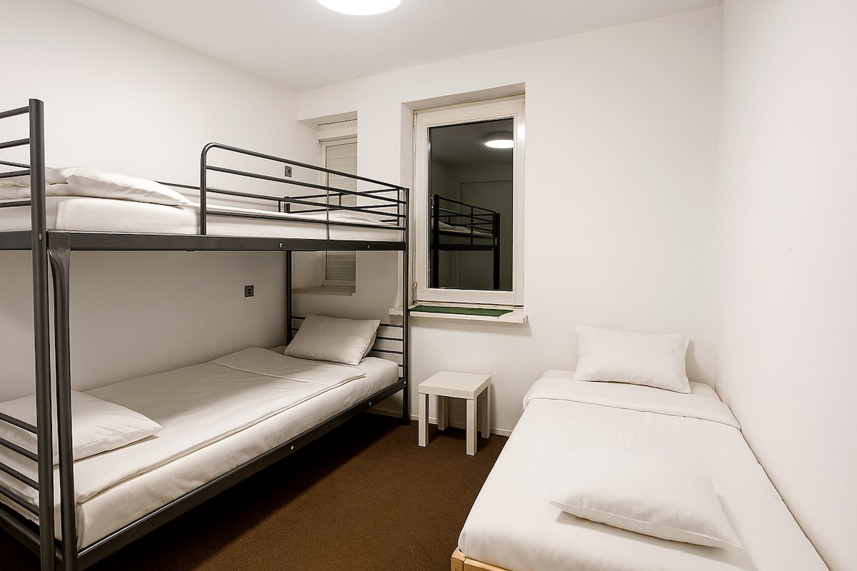 Igumbi leqela labantu abayi-6 elineebhedi ezikhweleneyo negumbi lokuhlambela elisetyenziswa kwipaseji. I-intanethi engenazintambo iyafumaneka egumbini. Iitawuli aziqukwanga kwixabiso. Igumbi alinayo ifestile. Izinto ezinokusetyenziswa kwigumbi ziquka izitulo, itafile, iikhabhathi / iidrowa zemithwalo, iipokotho zebhedi nganye yezinto ezincinci nezibane zokufunda. Iindwendwe zehostele zinokusebenzisa ikhitshi eliqhelekileyo nendawo yokutyela, indawo yokugcina imithwalo, igumbi lokudlala, ikona yekhompyutha.