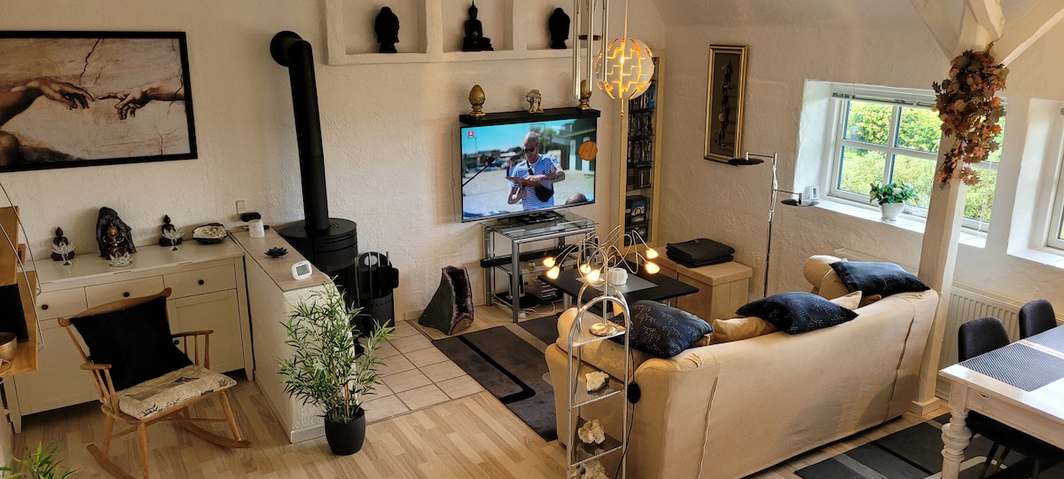 Iflethi okanye indlu ekwicomplex etofotofo embindini wedolophu ejonge i-fjord. Indawo yakho yokungena, ikhitshi, igumbi lokuhlala, igumbi lokuhlambela namagumbi okulala amabini. Nantsi yonke into oyidingayo; ikhitshi elinento yonke, umatshini wokuhlamba izitya nomatshini wokuhlamba impahla. Emva kwezinto zethu ezinokonwatyelwa njengondwendwe luka-Airbnb, sigxininise izinto esicinga ukuba zinikezela ngeyona ndawo yokuhlala, kuquka iibhedi ezintle namathuba okuhlamba. Indawo intle, kuphela 15 km. Klitmøller kunye 300 iimitha ukuya fjord. Kungenzeka ukutshaja imoto yombane. Ukuphuma. ukuthutha kanye emnyango. Abazithobileyo, uYakobi noRikke
