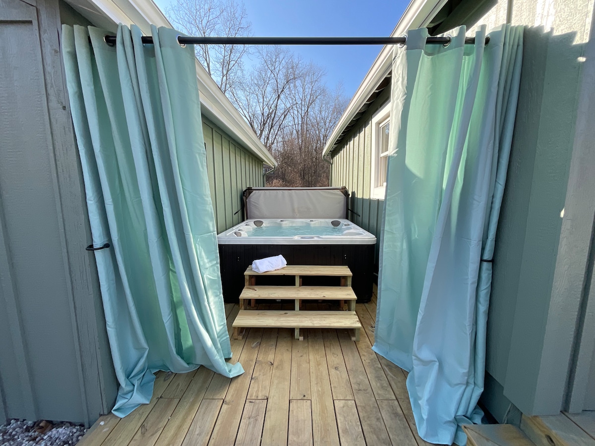 We look forward to welcoming you to the secluded beauty of our space, designed and built by my husband on our 20 acres of wooded property in the rolling hills of Central Ohio. A floor-to-ceiling glass front provides you with a view of fields green in summertime and ripe with goldenrod in the fall, four outdoor deck spaces invite you to relax in the beauty of nature, and a second story loft suite with a soaking tub are ready to provide you with rest and refreshment.