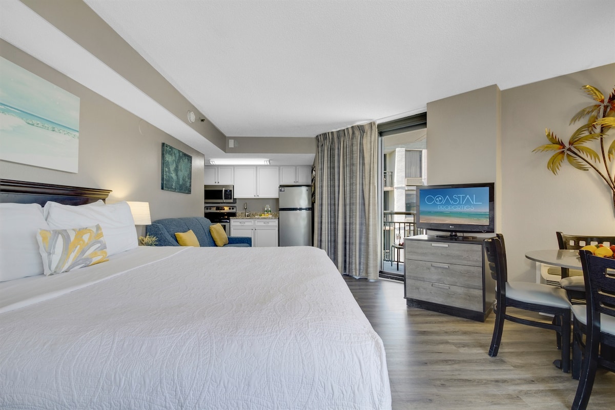 This condo at Camelot by the Sea is centrally located to the heart of Myrtle Beach both driving and walking. Find the beach just a few steps away. The newly renovated condo even offers a fully functional kitchen with everything you need to make this your next WFH getaway stay-cation. Comfy living room with a fold out sofa bed. Catch all of your favorite entertainment on one of the two large LED TVs, or better yet, enjoy the multiple pools, hot tub, and a lazy river that you can float in all day.