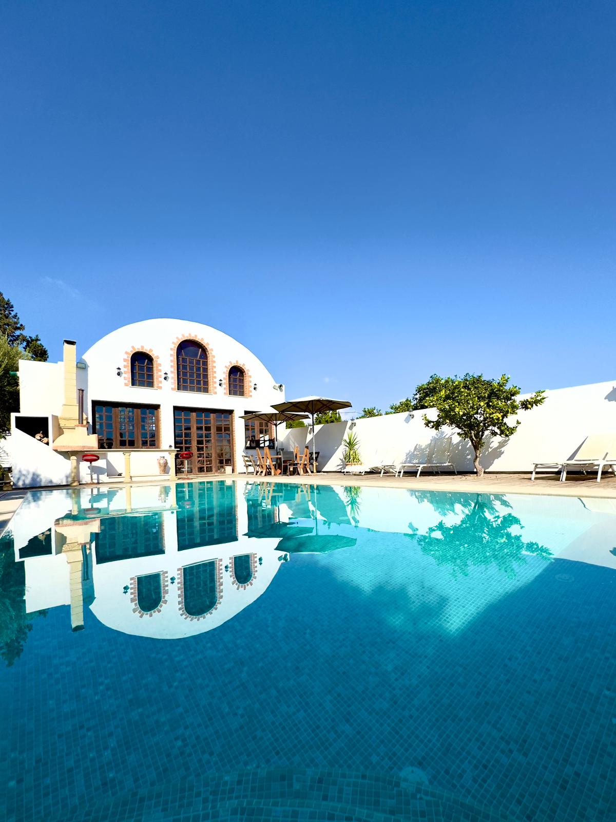 Résidence de caractère rénovée décoré dans le style minimaliste épuré d’Hammamet et revisité dans le style Mykonos (voutes croisées, fer forgée en noir) • Espace commun avec salon, coin repas face à une grande piscineChambre climatisée en même temps elle dispose d'un ventilateur suspendue style art-déco donnant sur une piscine privée le lit est construit dans l style Mykonos le sol est repeint à l'époxy blanc dans ce logement paisible et central. le séjour qui donnent sur une belle terrasse.