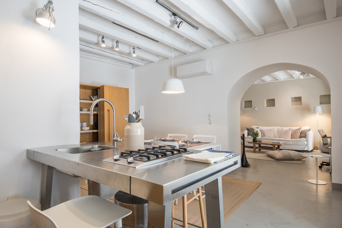 "I-Tonos" isembindini wedolophana yaseNaoussa, ibhloko nje enye ngasemva kolwandle lwe-Aegean seabreeze. Esi sakhiwo sakudala esinemigangatho emibini yaseCycladic sasikade siyivenkile yezinto zasekhaya ezidumileyo ibe xa yayilungiswa le ndawo ibe nguAirbnb, siye sagcina ubuhle bayo ngokugcina izinto ezininzi zokuqala kule venkile. Ngoko ngoxa uhleli apha, mhlawumbi kuza kuba ngathi uhlala kwikhathalogu yevenkile yendlu oyithandayo!