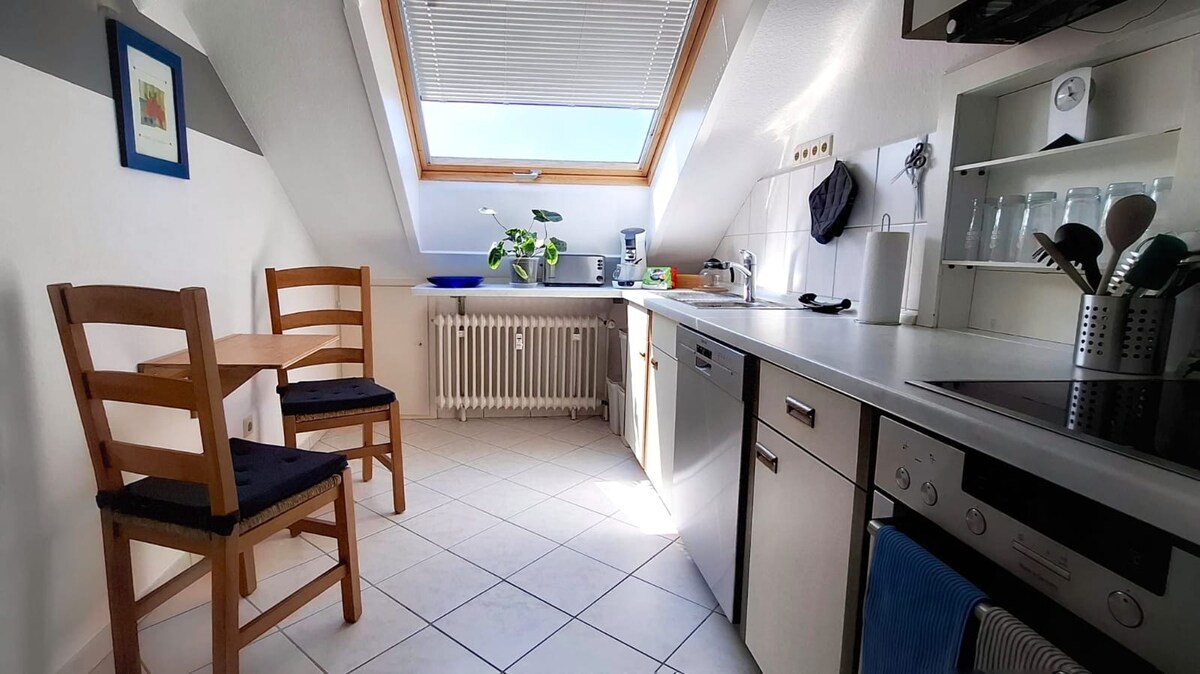 Iflethi entle enamagumbi amabini ( malunga ne-60 ²), eludongeni oluhle kufuphi neHeidelberg. Le flethi inegumbi lokuhlala elikhulu elinendawo yokuhlala, iTV, kunye indawo yokutyela enekhitshi elivulekileyo. Ikhitshi likumgangatho ophezulu kakhulu kwaye lanamhlanje. Kwipaseji eya kwigumbi lokulala, kukho nekhabhathi yokugcina iimpahla. Igumbi lokulala linebhedi elala abantu ababini, kunye nekhabhathi . Ecaleni kweflethi kukho igadi (utshani) enokusetyenziswa.