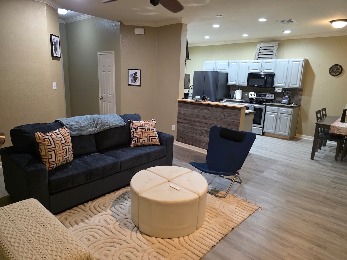 Tsiba ihotele uze wonwabele ukusebenzisa ngokukhethekileyo igumbi elinomnyango ophumela ngaphandle eliyi-1200 sqft kwindawo yabucala! Indawo yahlulwe ngokukhuselekileyo ngokusetyenziswa ngokukhethekileyo kwendawo yokungena engaphambili xa kuhanjiswa. Ingingqi ithule, ikhuselekile, kwaye ikufuphi kuyo yonke into. Amagumbi okulala ayi-2, ibhafu epheleleyo/ ibhafu yokuntywila, igumbi lokuhlala, ijimu yasekhaya, kunye neziko leziselo/izimuncumuncu, kunye netafile yepuli kunye ne-smart TV kuyo yonke indawo. Ukuzingenela (ukufika emva kwexesha kulungile) nokuphuma ngaphandle kokuphuma. Ipaki, ibala lokudlala, ipuli neendlela zokuhamba ezikwindawo eyi-1/2. Kulula ukuhamba.