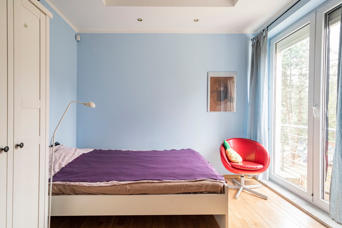 Auris under the trees: odpręż się i zrelaksuj w tej spokojnej, stylowej przestrzeni. W pełni wyposażona stodoła otoczona sosnami położona jest w Ludwikowie, zaledwie 50 km od centrum Warszawy. Działkę od rzeki Wkry dzieli 10 minut autem. Wokół doznać można łona natury, śpiewu ptaków, ciszy i spokoju. Przed chatą jest taras, wyposażony w gąszcz egzotycznych roślin, ogromny stół do gier planszowych i pysznego jedzonka, z grillem oraz miejscem na ognisko. Domek jest całoroczny.