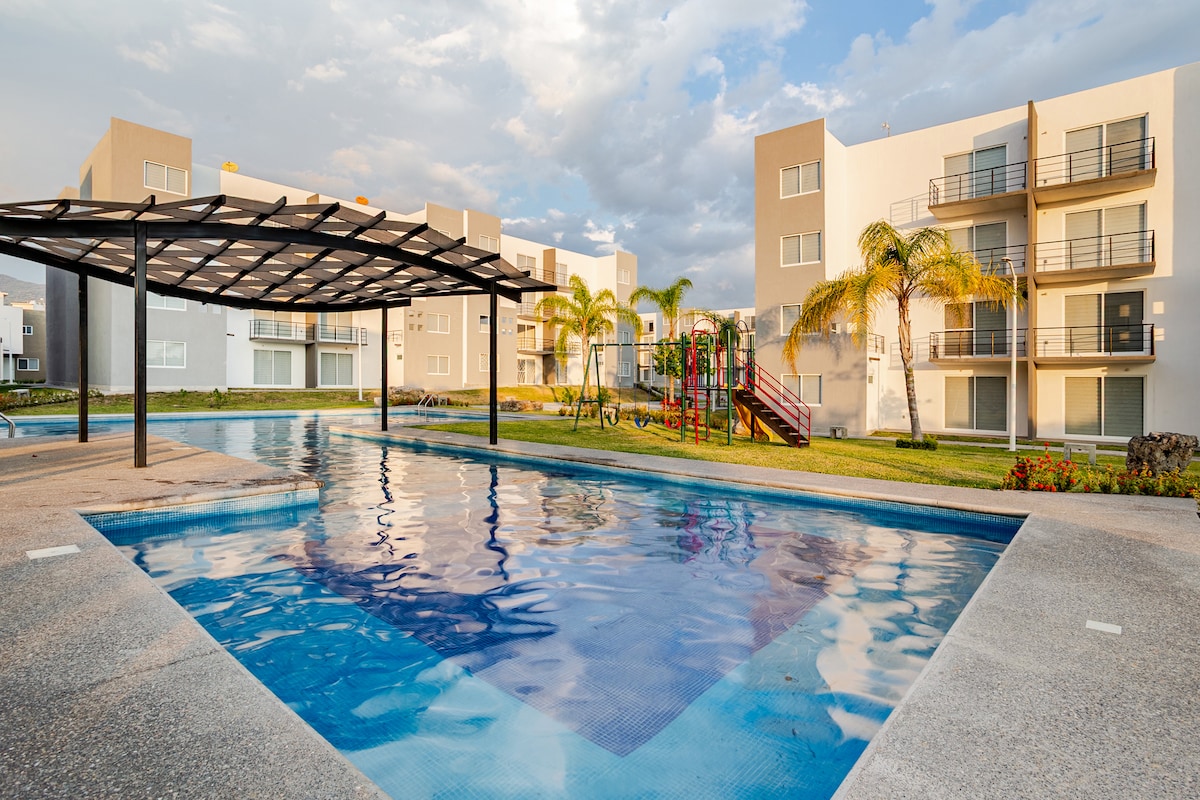 Imizuzu eyi-80 ukusuka kwi-CDMX nemizuzu eyi-15 ukusuka eTepoztlan. Depa familiar decorado/amueblado con amor y pensado para esos dias de descanso y diversion, con total comodidad y amplitud. Vigilancia 24/7 y con un clima que no falla! Bienvenidos a Cocoyoc. // Imizuzu eyi-80 ukusuka kwi-CDMX, imizuzu eyi-15 ukusuka eTepoztlán. Iflethi okanye indlu ekwicomplex yentsapho ehonjiswe / enefenitshala enothando ibe yenzelwe ezo ntsuku zokuphumla nokuzonwabisa, ibe itofotofo ibe ivulekile. Ukubekwa esweni imini nobusuku kunye nemozulu engaphumeleliyo! Wamkelekile eCocoyoc.