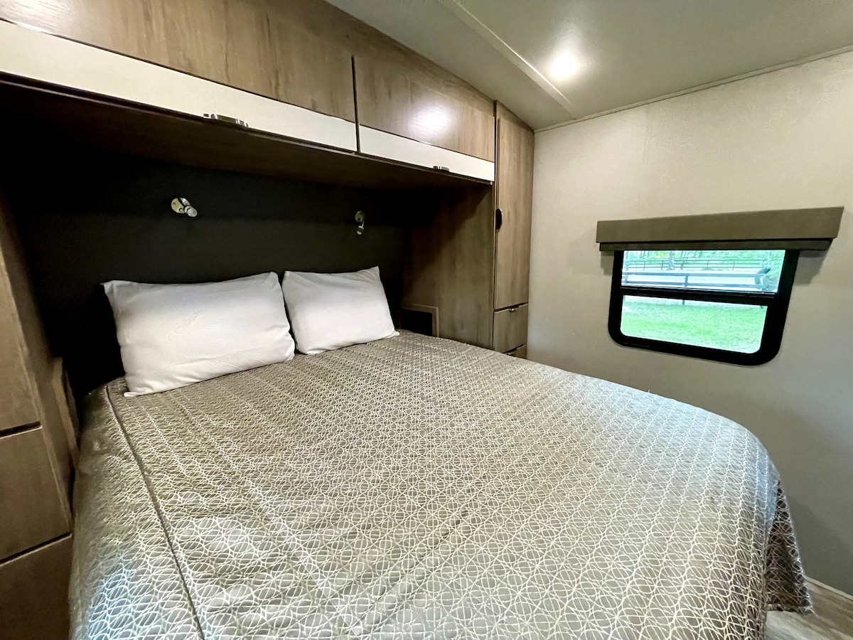 I-RV entle, emsulwa phakathi kweefama zamahashe zembali. Ukukhwela, ibhayisekile, ukuqubha, i-kayak, i-SUP nezinye izinto ezininzi kwiyadi yethu engasemva. Hlala kwifama yamahashe esebenzayo kwindawo yabucala, ekhuselekileyo ekufutshane neendawo ezininzi ezinika umdla! Ubukhulu bokumkanikazi bubi ngomatrasi ophezulu kunye ne-foam topper, ishawa ende enesitulo nekhitshi elinezinto ezimbalwa ezisisiseko eziquka umatshini wekofu weKeurig kunye nee-pods, iiglasi zewayini, iimbiza, izitya, isepha yezitya, ishampu, iitawuli njl.